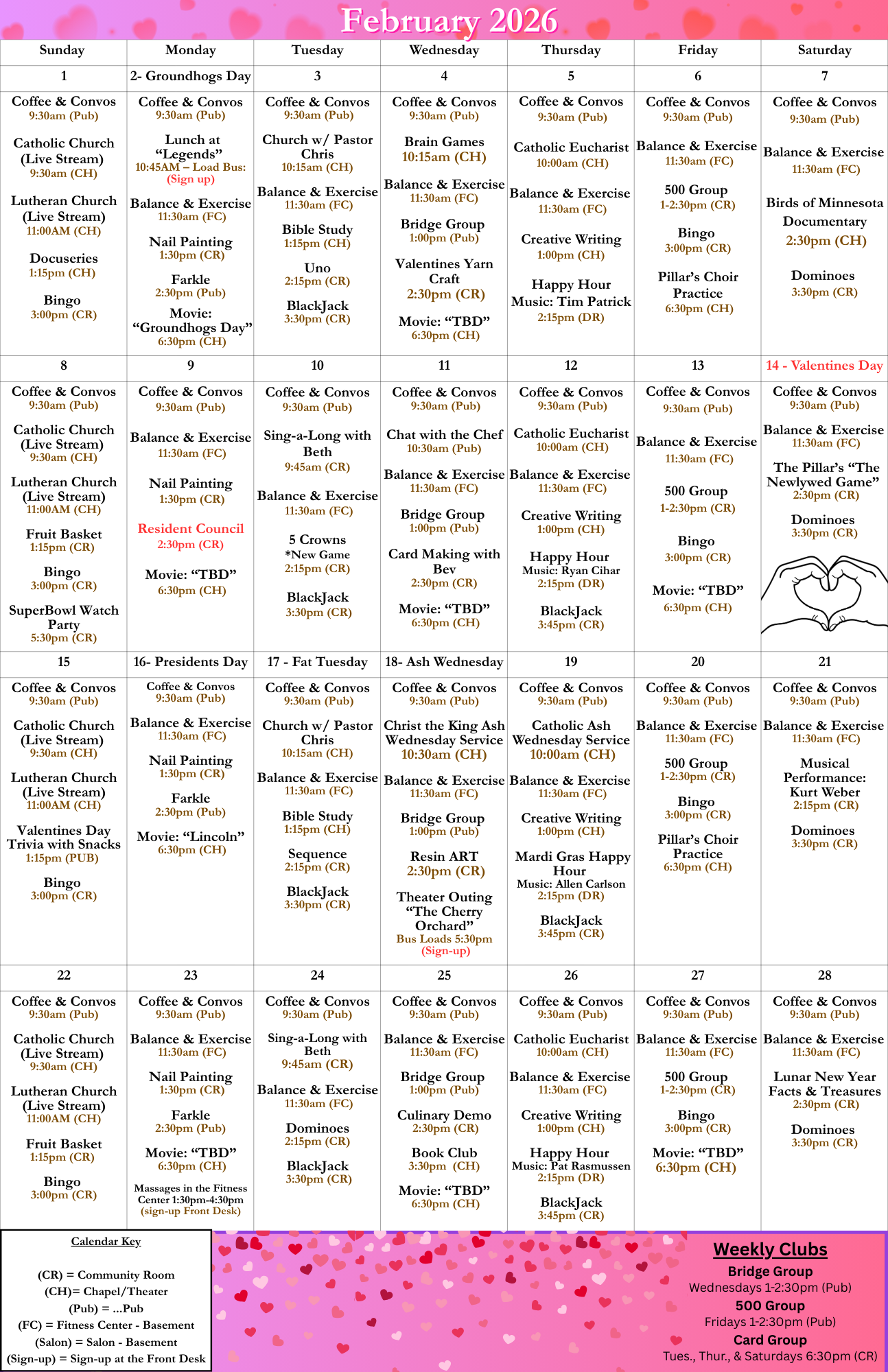 Keep up with everything going on at The Pillars of Mankato from our calendar of upcoming events and newsletters. We’re all about enjoying the good life at our Mankato senior living community, where friends come to enjoy each other’s company and bond over a new hobby.